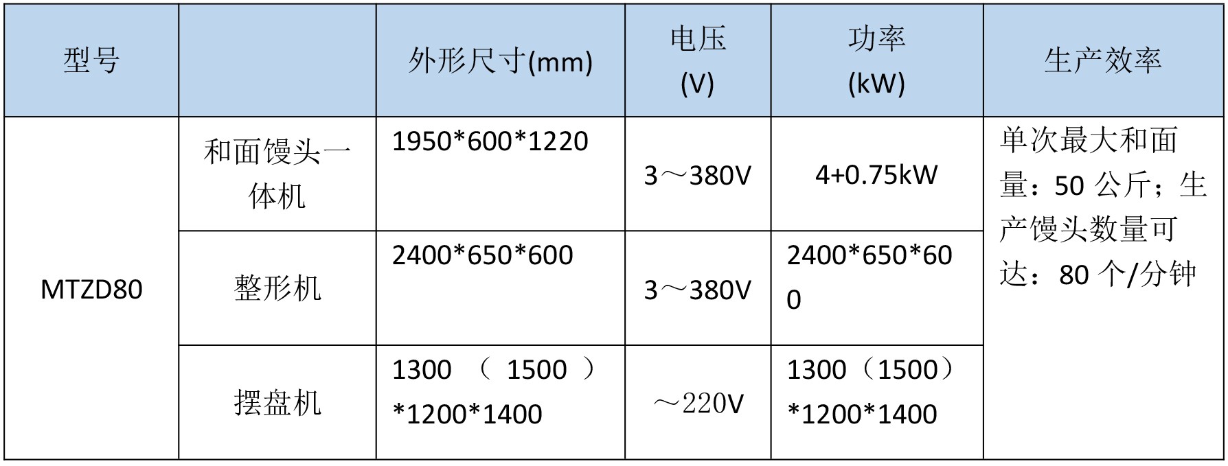 MTZD80型饅頭流水線是我公司為大型食堂和配餐中心設(shè)計(jì)制造的自動(dòng)化饅頭加工設(shè)備,包含了和面饅頭一體機(jī)、整形輸送機(jī)和自動(dòng)擺盤(pán)機(jī)三個(gè)部分,也可拆分開(kāi)單獨(dú)使用其中的任意一臺(tái)單體